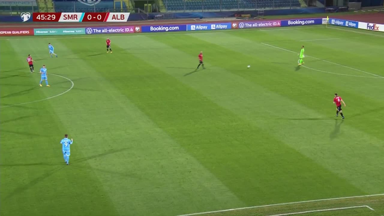 Tiro atajado raso al centro del arco. Myrto Uzuni (Albania) zurdazo sin ángulo desde la izquierda.