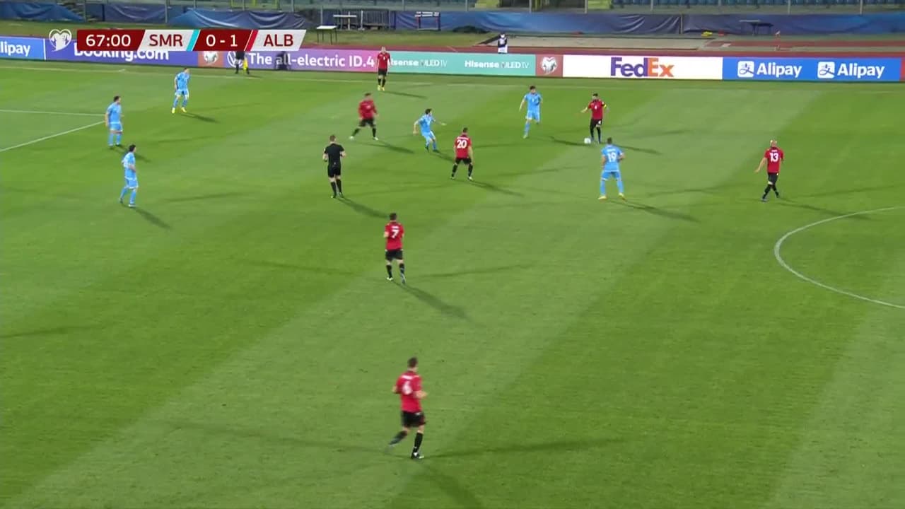 Tiro atajado raso al centro del arco. Myrto Uzuni (Albania) Disparo con la derecha desde el lado derecho dentro del área. Asistencia de Rey Manaj.