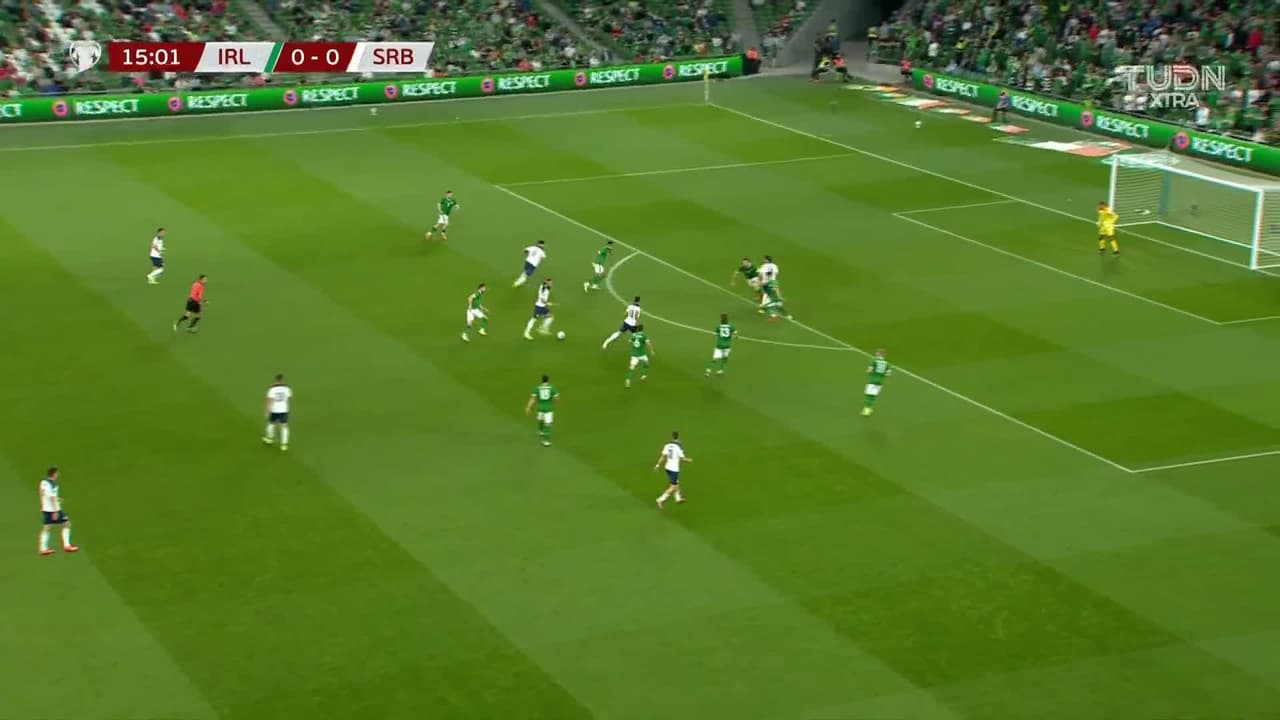 Tiro atajado raso al centro del arco. Nemanja Gudelj (Serbia) Disparo con la derecha desde fuera del área.