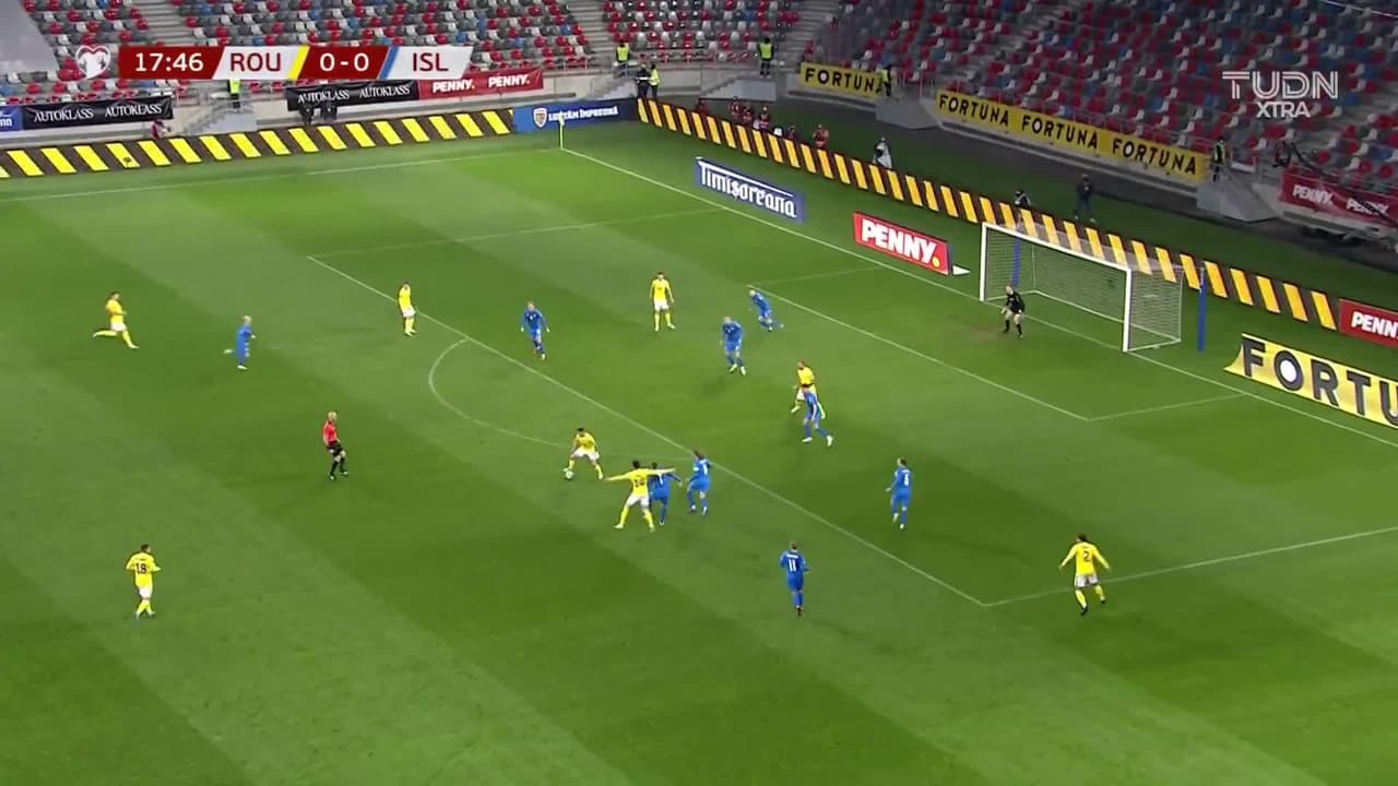 Tiro atajado. Nicolae Claudiu Stanciu (Rumanía) zurdazo desde fuera del área.