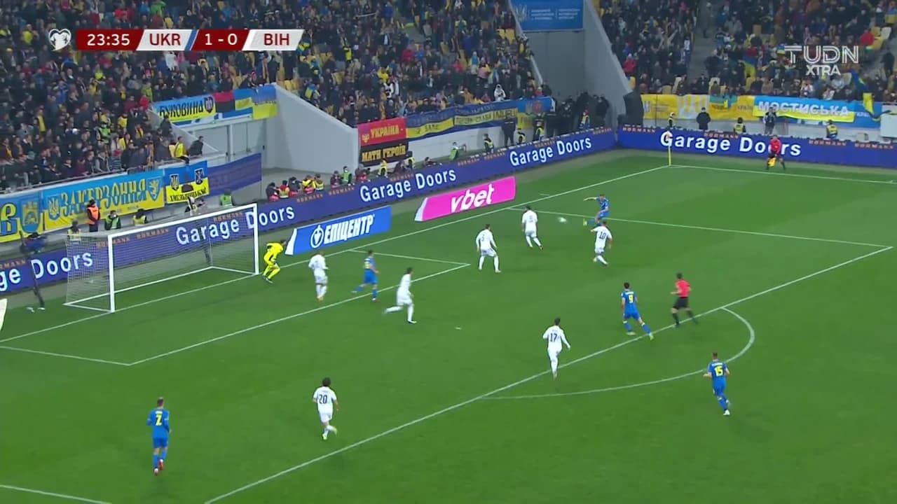 Tiro atajado Por arriba en el centro del arco. Oleksandr Tymchyk (Ucrania) Disparo con la derecha desde el centro del área. Asistencia de Eduard Sobol.