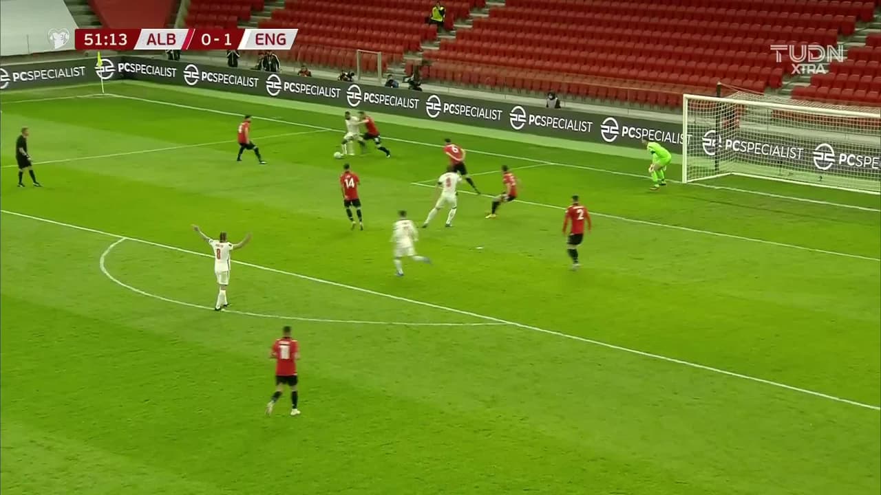 Tiro atajado. Phil Foden (Inglaterra) zurdazo desde el centro del área.