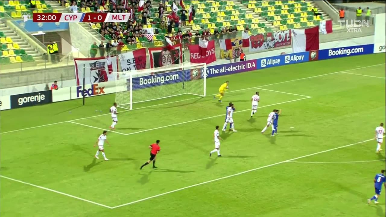Tiro atajado junto al lado derecho de la portería. Pieros Sotiriou (Chipre) disparo de cabeza desde el centro del área. Asistencia de Fotios Papoulis con un centro al área.
