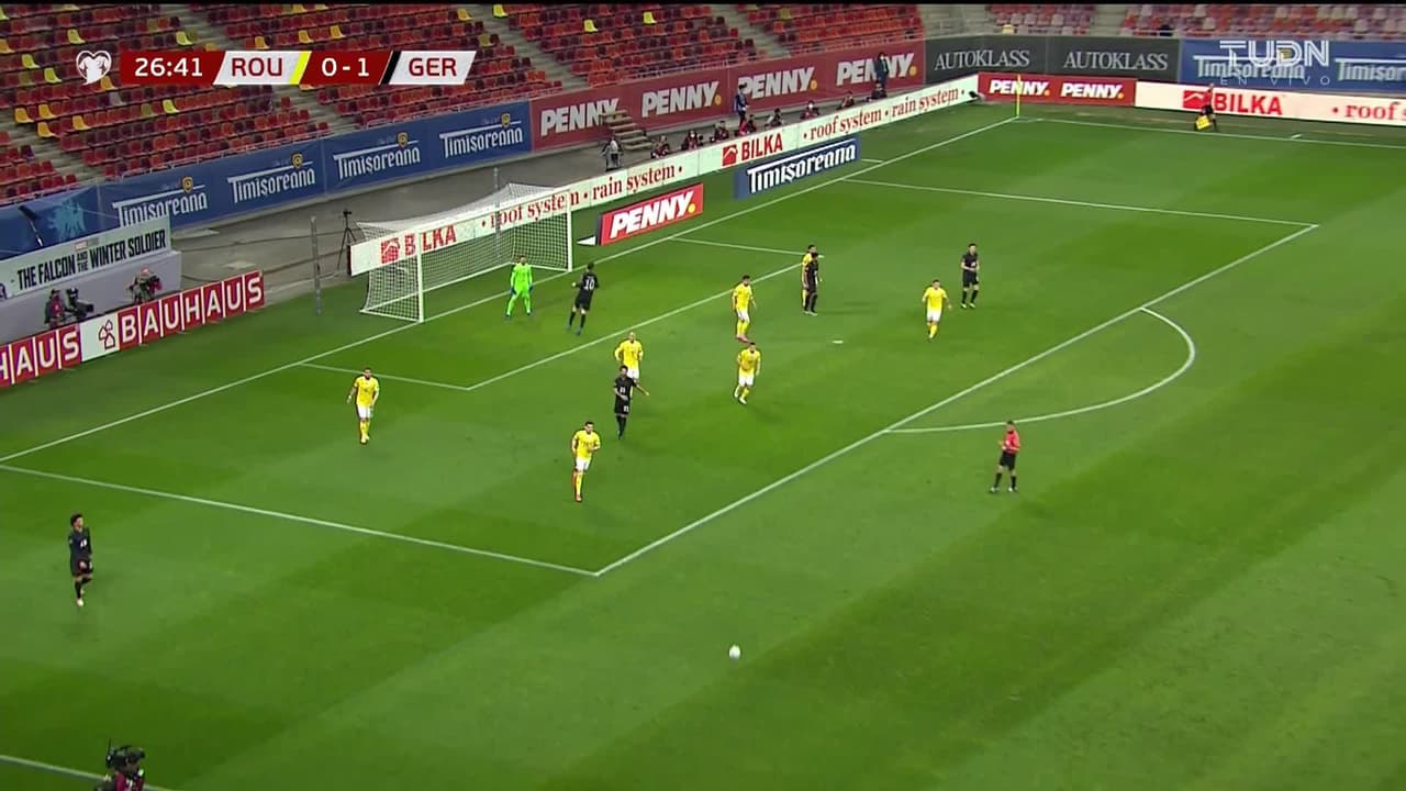 Tiro atajado raso al centro del arco. Razvan Marin (Rumanía) Disparo con la derecha desde fuera del área. Asistencia de Ianis Hagi.