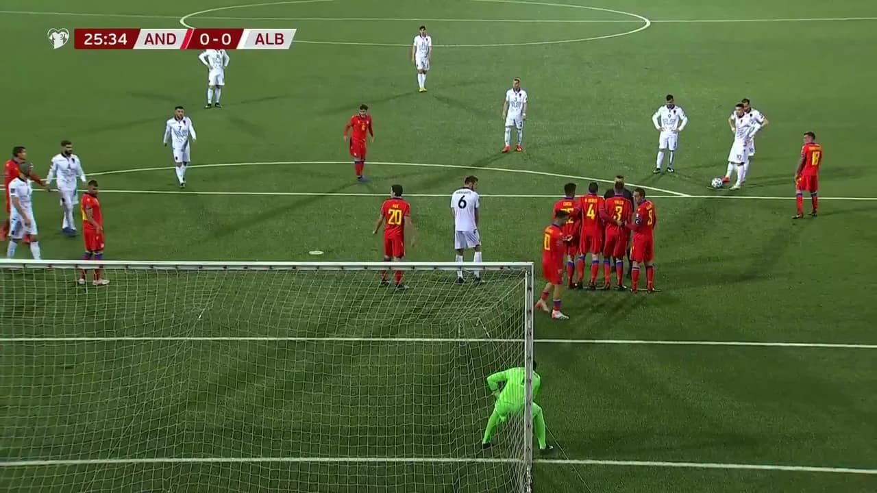 Tiro atajado raso al centro del arco. Rey Manaj (Albania) Disparo con la derecha desde fuera del área.
