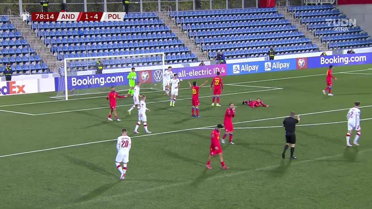 Tiro atajado por abajo a la izquierda. Robert Lewandowski (Polonia) disparo de cabeza desde el centro del área. Asistencia de Piotr Zielinski con un centro al área.