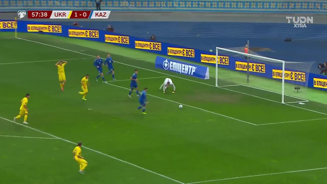 Tiro atajado junto al lado derecho de la portería. Roman Yaremchuk (Ucrania) Disparo con la derecha desde el lado izquierdo dentro del área. Asistencia de Oleksandr Zinchenko.