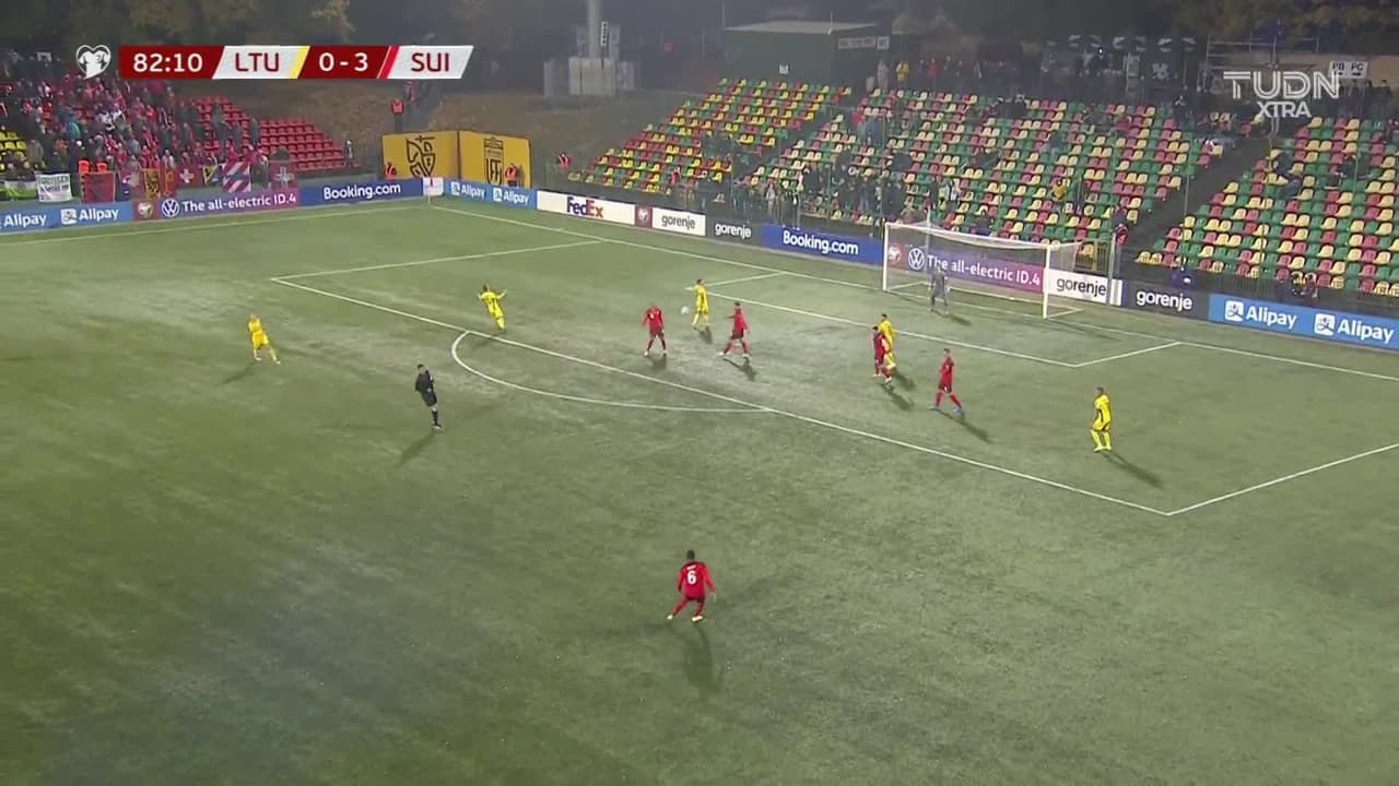 Tiro atajado por abajo a la izquierda. Ruben Vargas (Suiza) Disparo con la derecha desde el lado izquierdo dentro del área.