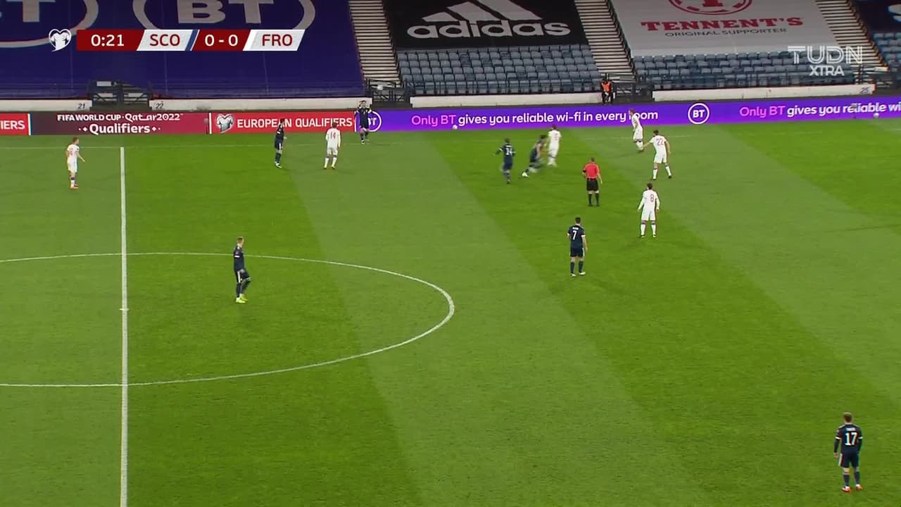 Tiro atajado raso al centro del arco. Ryan Fraser (Escocia) zurdazo desde el lado derecho dentro del área.