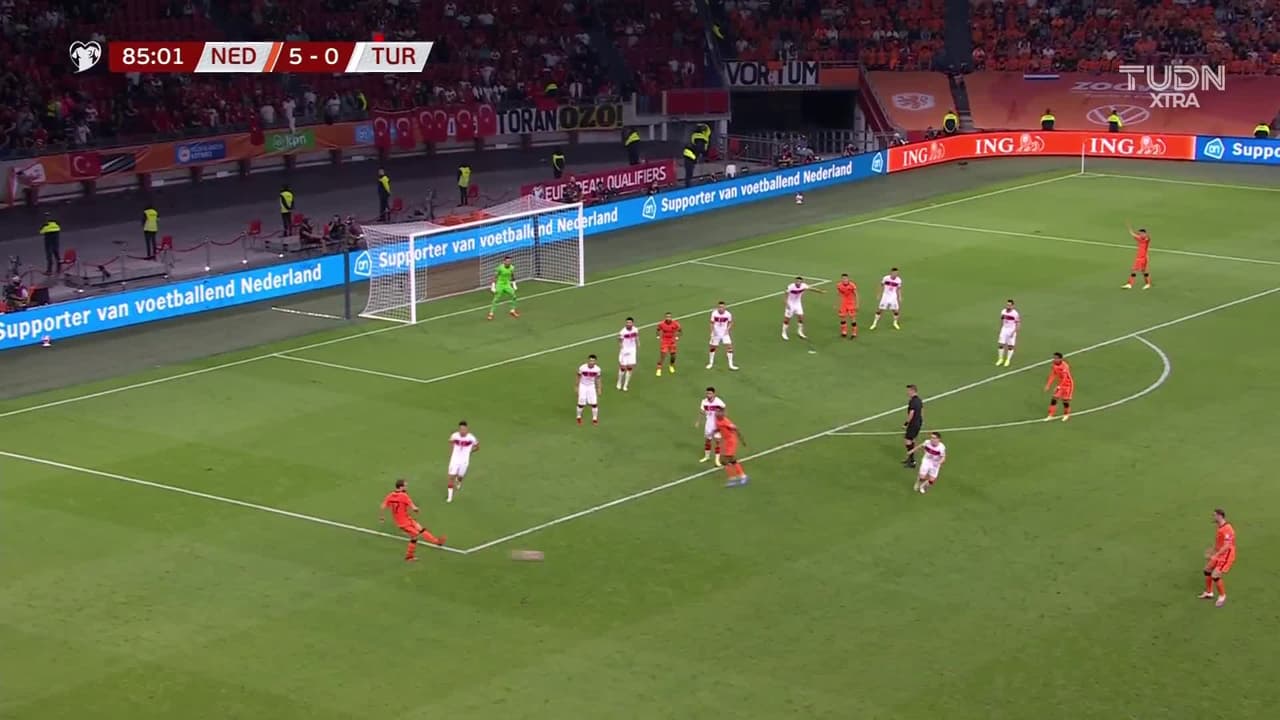 Remate parado por bajo a la izquierda. Ryan Gravenberch (Holanda) remate con la izquierda desde fuera del área. Asistencia de Donyell Malen.