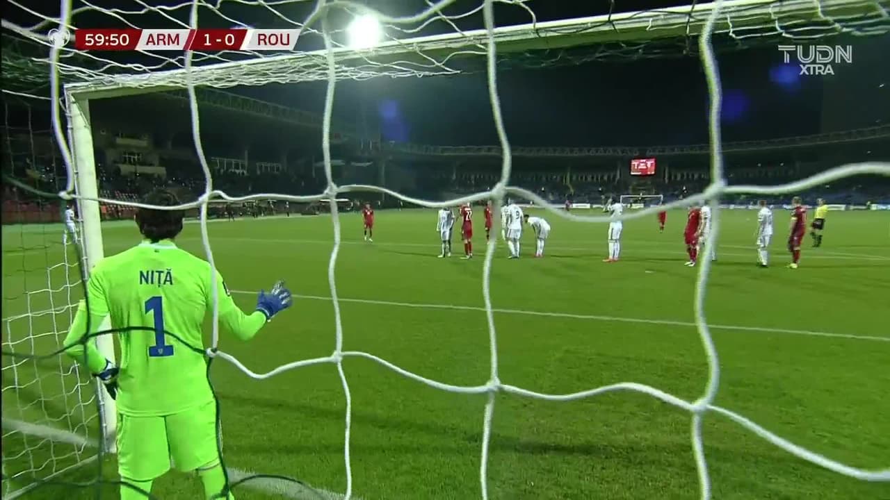 Tiro atajado por abajo a la izquierda. Sargis Adamyan (Armenia) disparo de cabeza desde el lado derecho dentro del área. Asistencia de Tigran Barseghyan con un centro al área.