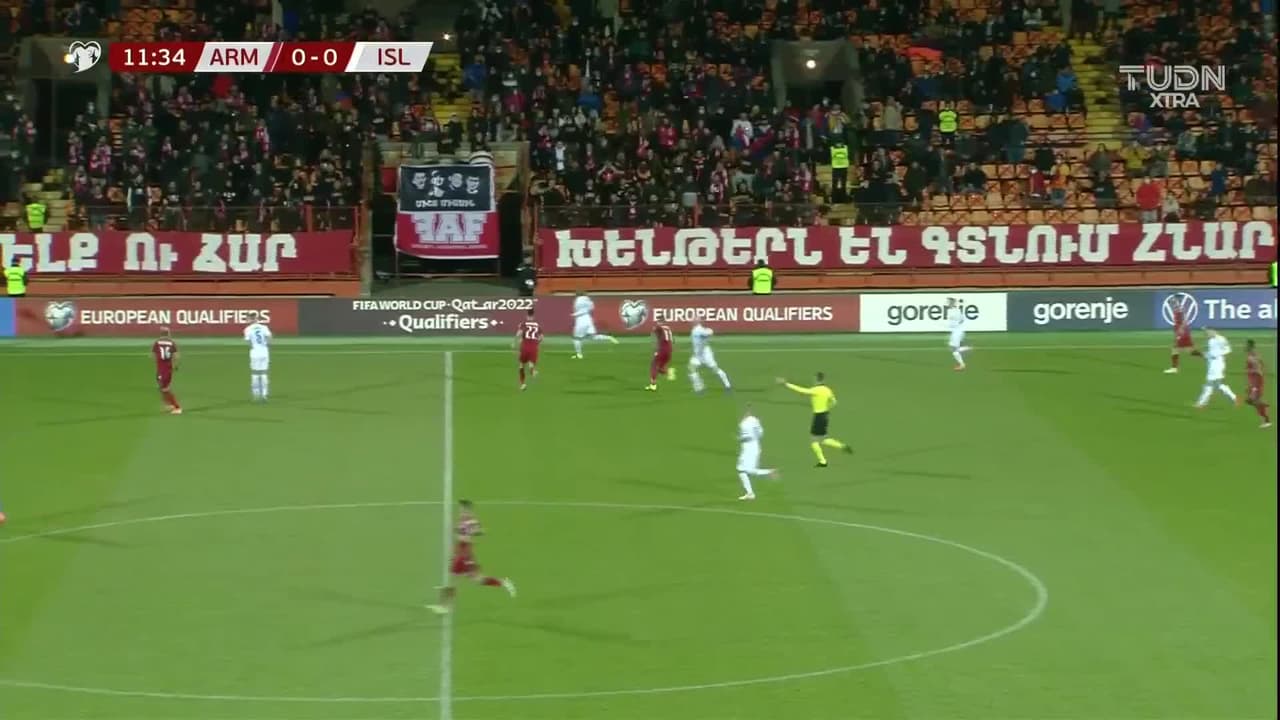 Tiro atajado Por arriba en el centro del arco. Solomon Ime Udo (Armenia) Disparo con la derecha desde fuera del área.