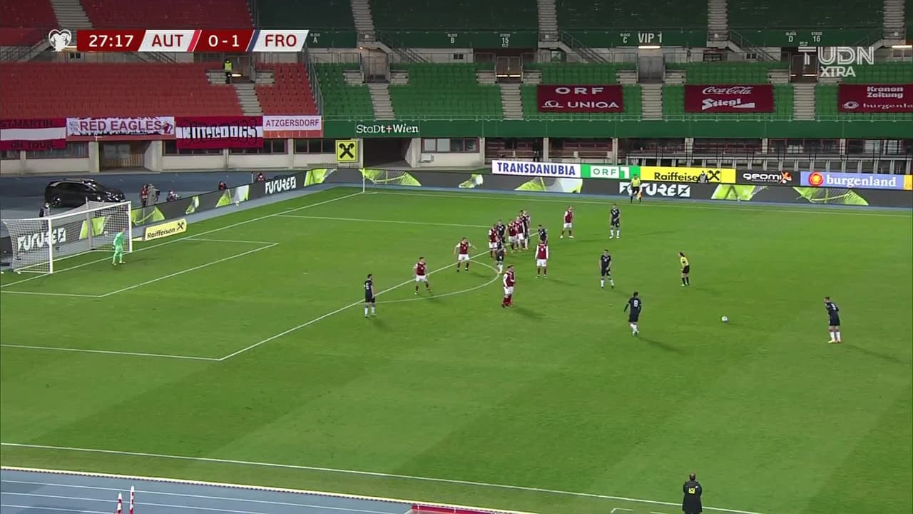 Tiro atajado junto al lado derecho de la portería. Sonni Nattestad (Islas Faroe) disparo de cabeza a quemarropa desde el lado derecho. Asistencia de Brandur Hendriksson Olsen con un centro al área.