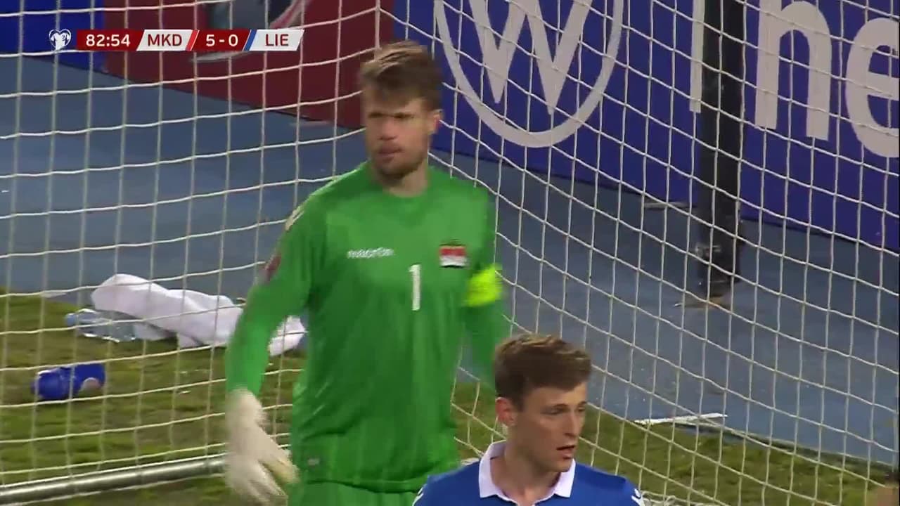 Tiro atajado junto al lado derecho de la portería. Stefan Askovski (Macedonia) zurdazo desde fuera del área.