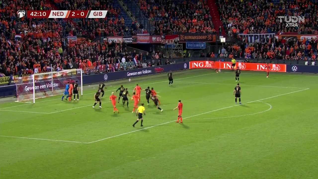 Tiro atajado al ángulo superior derecho. Stefan de Vrij (Holanda) disparo de cabeza a quemarropa desde el lado derecho. Asistencia de Steven Berghuis con un centro al área.