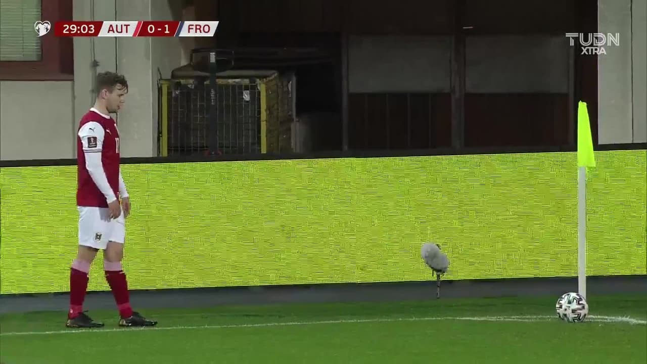 Tiro atajado. Stefan Lainer (Austria) disparo de cabeza desde el centro del área.