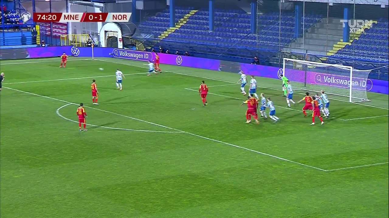 Tiro atajado junto al lado derecho de la portería. Stefan Savic (Montenegro) disparo de cabeza desde el centro del área. Asistencia de Sead Haksabanovic con un centro al área.