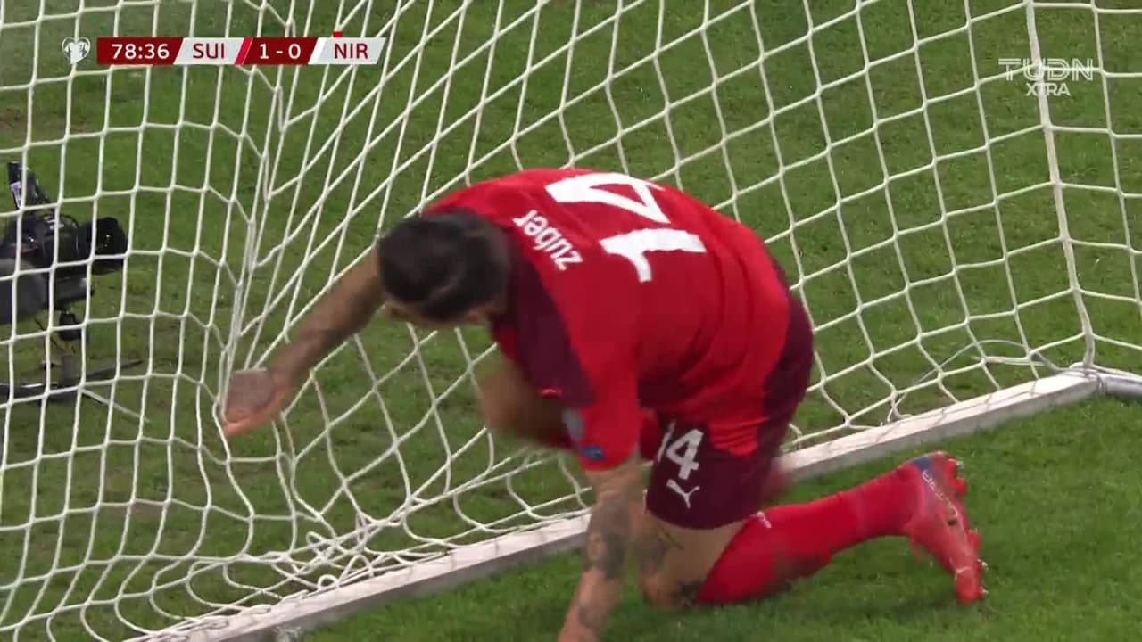 Tiro atajado raso al centro del arco. Steven Zuber (Suiza) con un tiro desde muy cerca. Asistencia de Ricardo Rodríguez con un pase de cabeza.