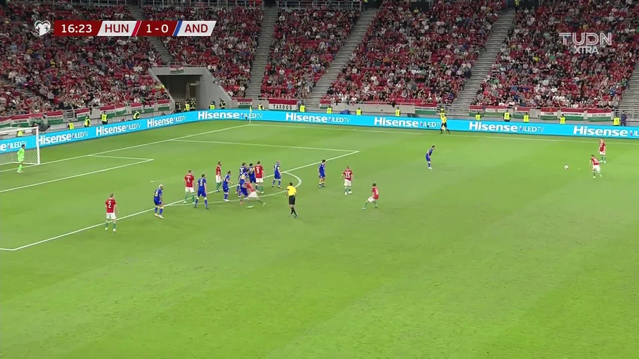 Tiro atajado. Szabolcs Schön (Hungría) zurdazo desde fuera del área.