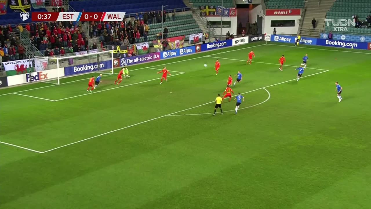 Tiro atajado junto al lado derecho de la portería. Taijo Teniste (Estonia) Disparo con la derecha desde muy lejos y sin ángulo. Asistencia de Karol Mets con un pase de cabeza.