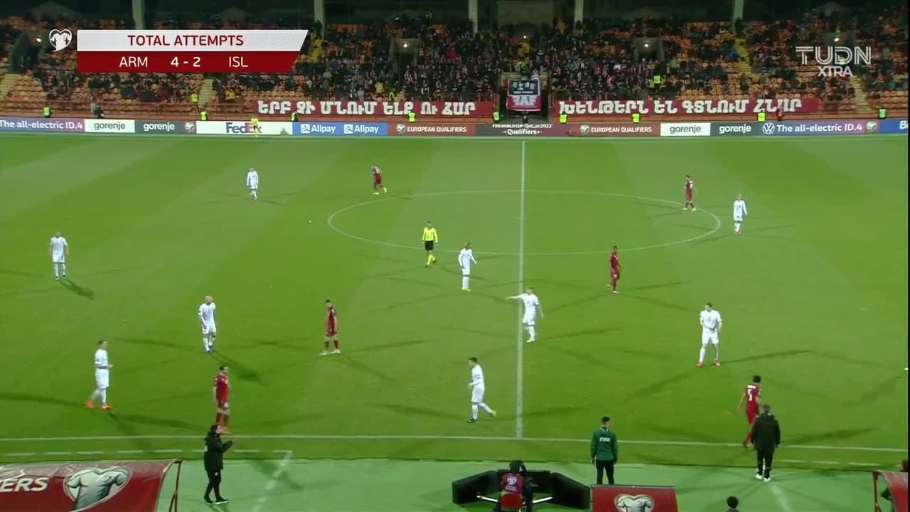 Tiro atajado raso al centro del arco. Tigran Barseghyan (Armenia) zurdazo desde fuera del área. Asistencia de Norberto Briasco.