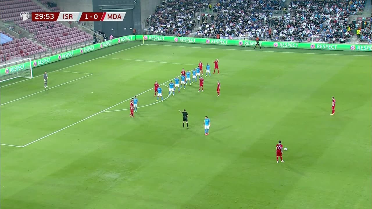 Tiro atajado al ángulo superior derecho. Veaceslav Posmac (Moldova) disparo de cabeza desde el centro del área. Asistencia de Eugeniu Cociuc pase largo.
