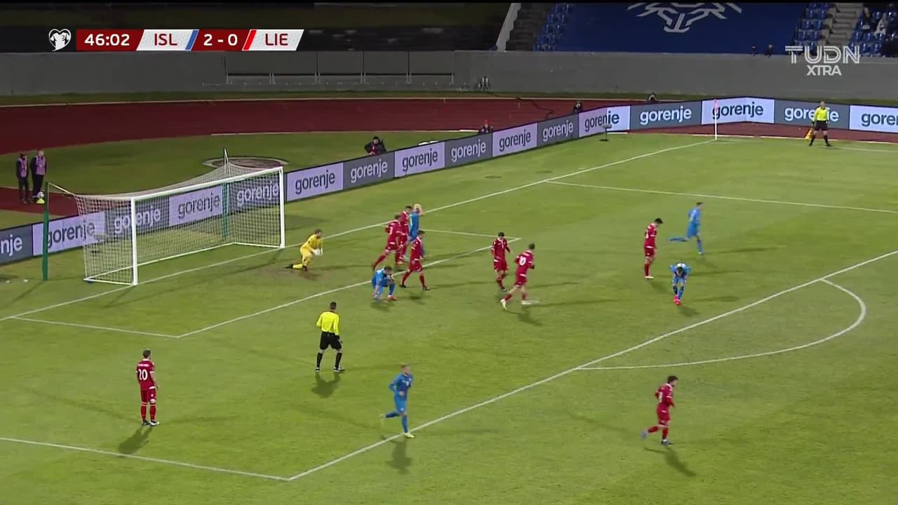 Tiro atajado. Vidar Örn Kjartansson (Islandia) Disparo con la derecha desde el centro del área.