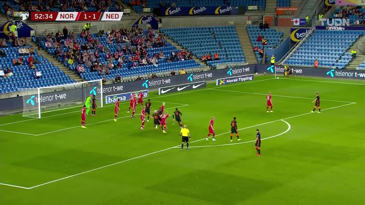 Tiro atajado raso al centro del arco. Virgil van Dijk (Holanda) disparo de cabeza desde el centro del área. Asistencia de Memphis Depay con un centro al área.