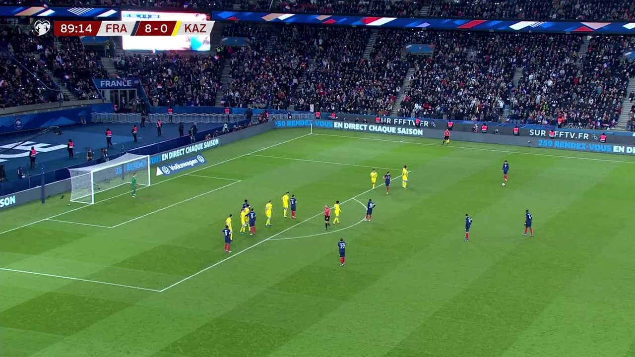 Tiro atajado. Wissam Ben Yedder (Francia) disparo de cabeza desde el centro del área.