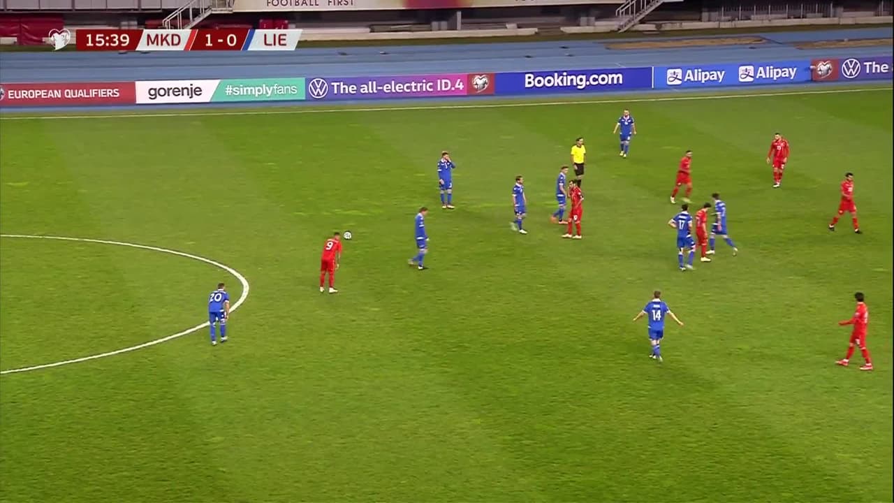 Tiro atajado raso al centro del arco. Yanik Frick (Liechtenstein) Disparo con la derecha desde fuera del área.