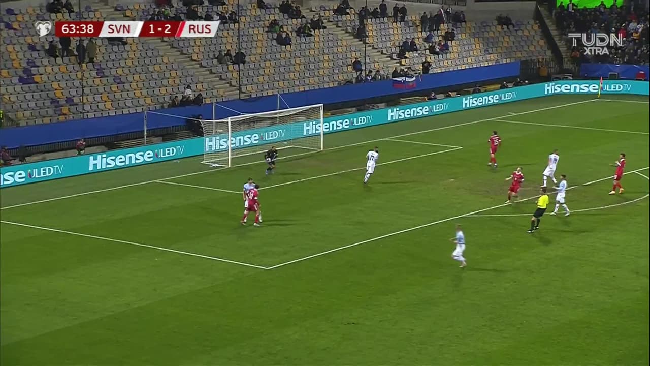 Tiro atajado por abajo a la izquierda. Zelimkhan Bakaev (Rusia) zurdazo desde el lado izquierdo dentro del área. Asistencia de Aleksey Miranchuk.