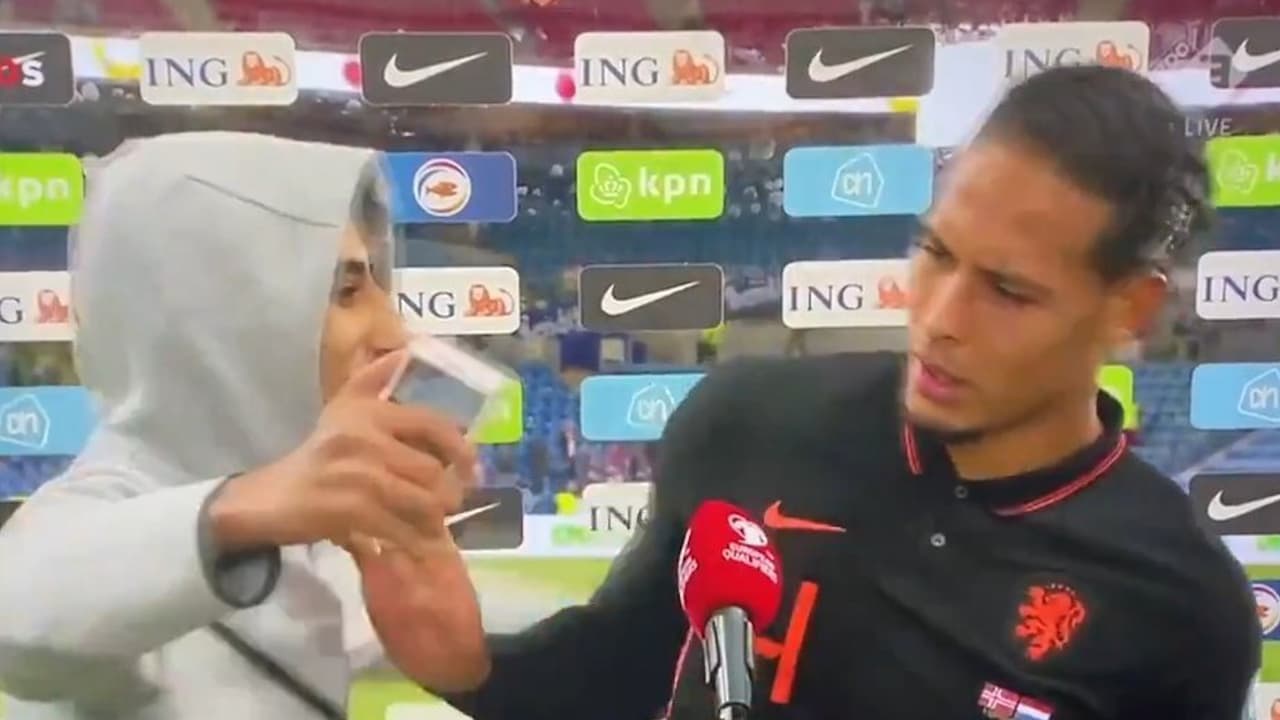 Van Dijk empuja a aficionado en plena entrevista tras el Noruega-Países Bajos
