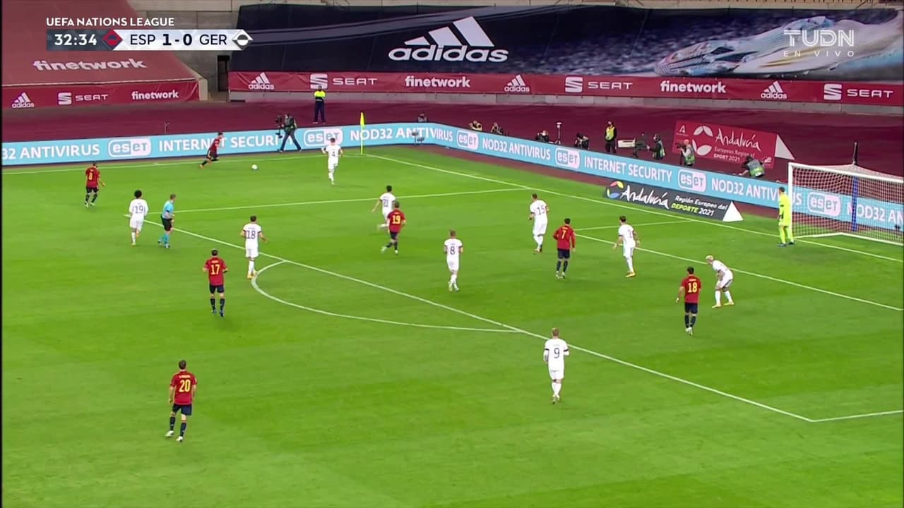 Dani Olmo (España) remata palo| Disparo con la derecha desde el centro del área.