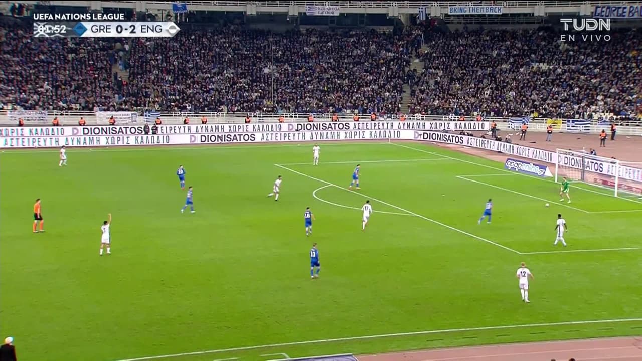 ¡Gol! Grecia 0| Inglaterra 3. Curtis Jones (Inglaterra) Disparo con la derecha desde el centro del área.