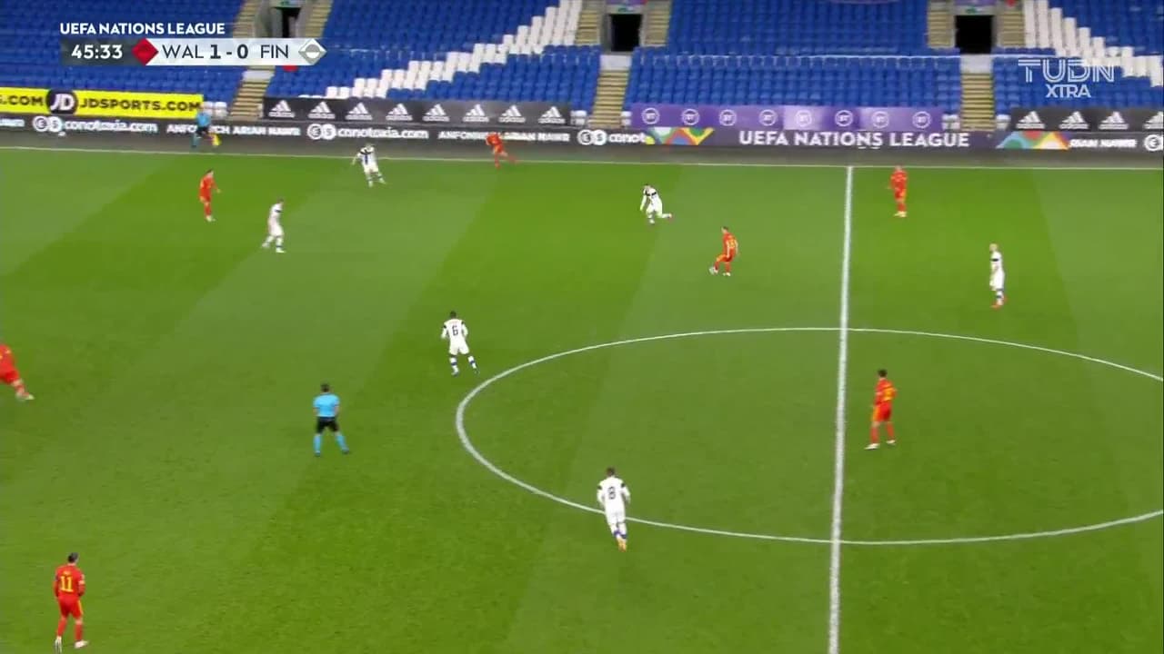 ¡Gol! Gales 2| Finlandia 0. Daniel James (Gales) Disparo con la derecha desde fuera del área.
