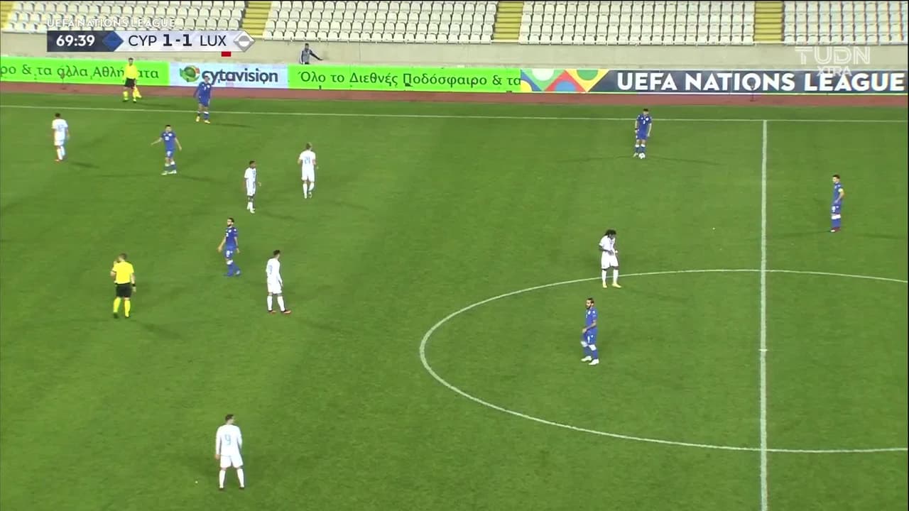 ¡Gol! Chipre 2| Luxemburgo 1. Grigoris Kastanos (Chipre) zurdazo desde el centro del área al centro de la portería. Asistencia de Marios Ilia después de un pase en profundidad.