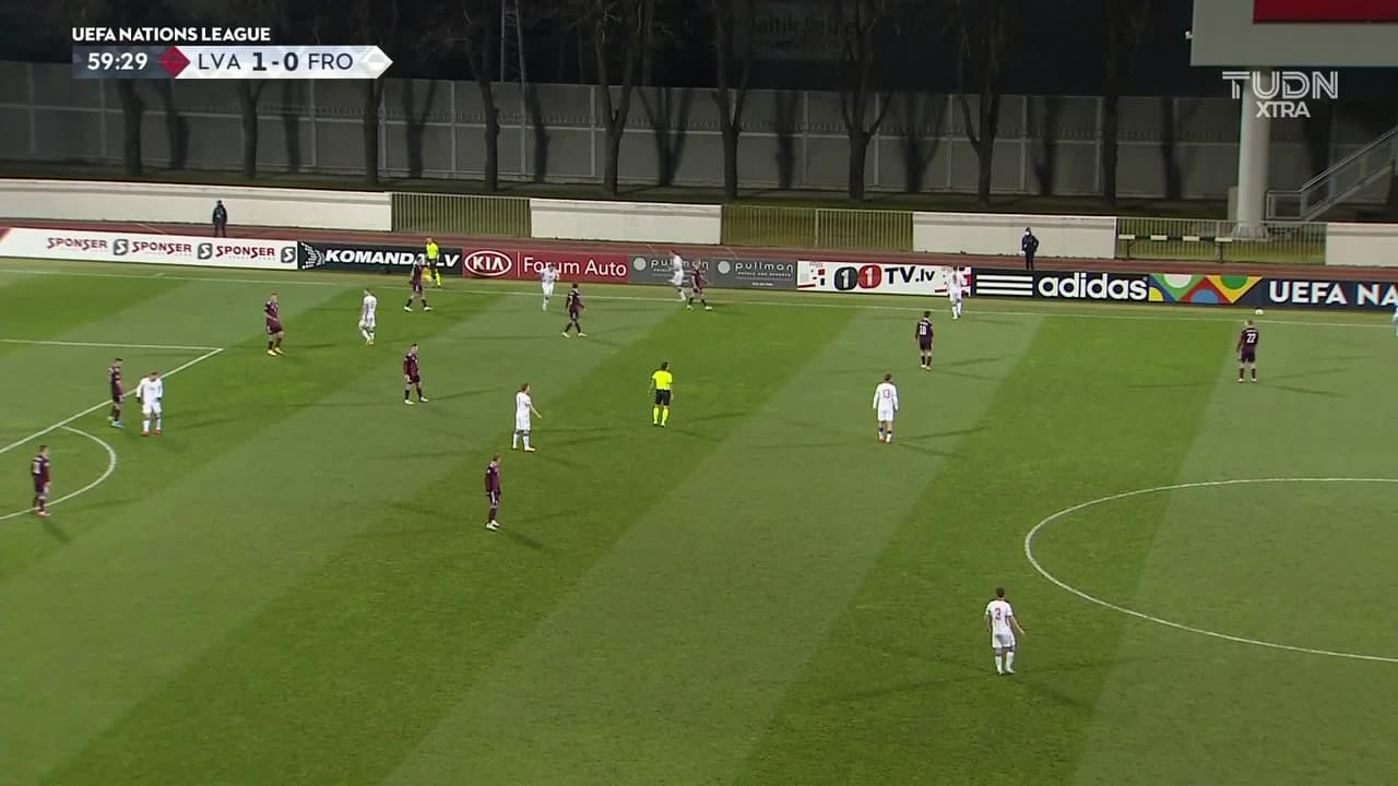 ¡Gol! Letonia 1| Islas Faroe 1. Gunnar Vatnhamar (Islas Faroe) disparo de cabeza desde el centro del área al ángulo superior izquierdo. Asistencia de Viljormur Davidsen con un centro al área.