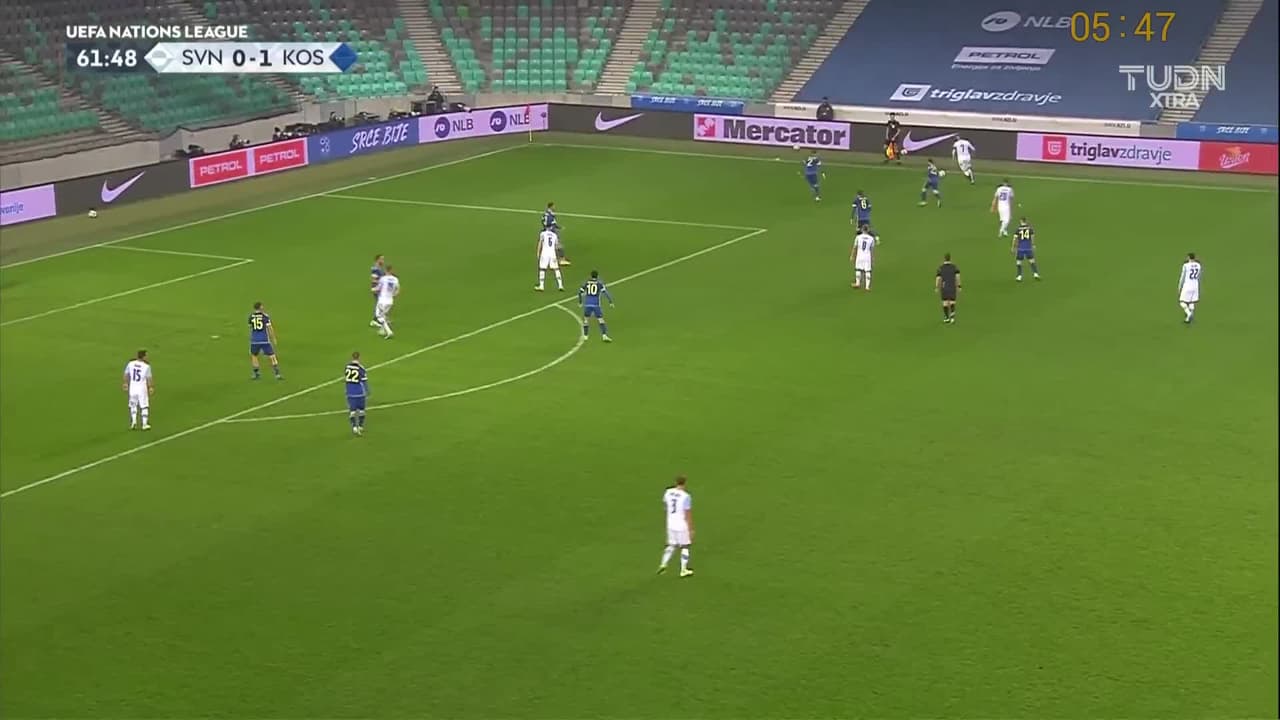 ¡Gol! Eslovenia 1| Kosovo 1. Jasmin Kurtic (Eslovenia) Disparo con la derecha a quemarropa desde el lado derecho.