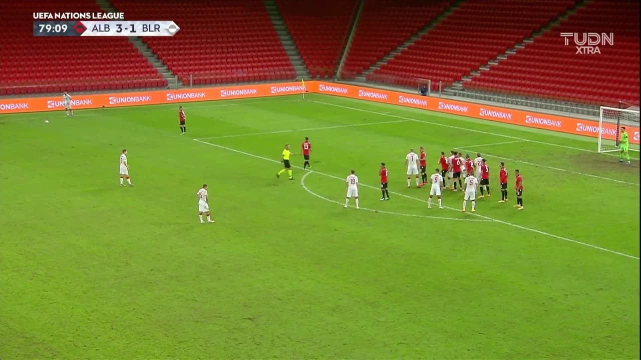 ¡Gol! Albania 3| Bielorrusia 2. Afrid Max Ebong Ngome (Bielorrusia) Disparo con la derecha desde el centro del área tras un saque de esquina.