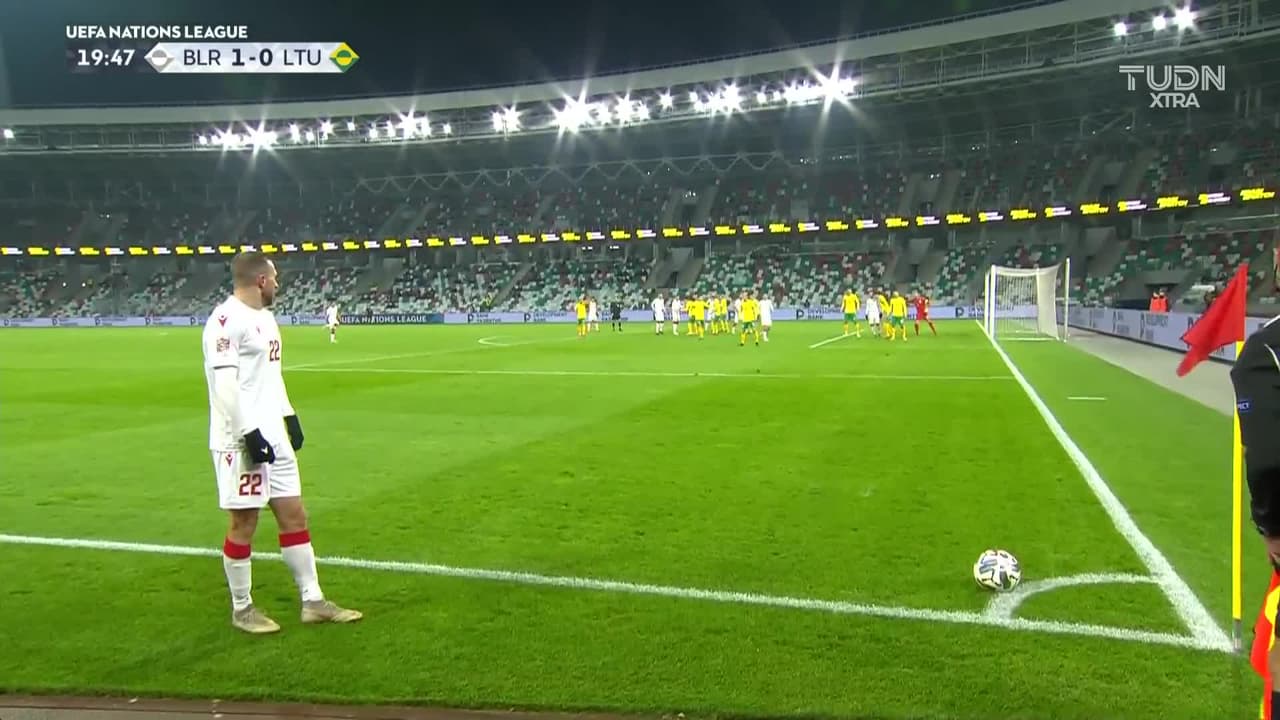 ¡Gol! Bielorrusia 2| Lituania 0. Afrid Max Ebong Ngome (Bielorrusia) zurdazo a quemarropa desde el lado izquierdo tras un saque de esquina.
