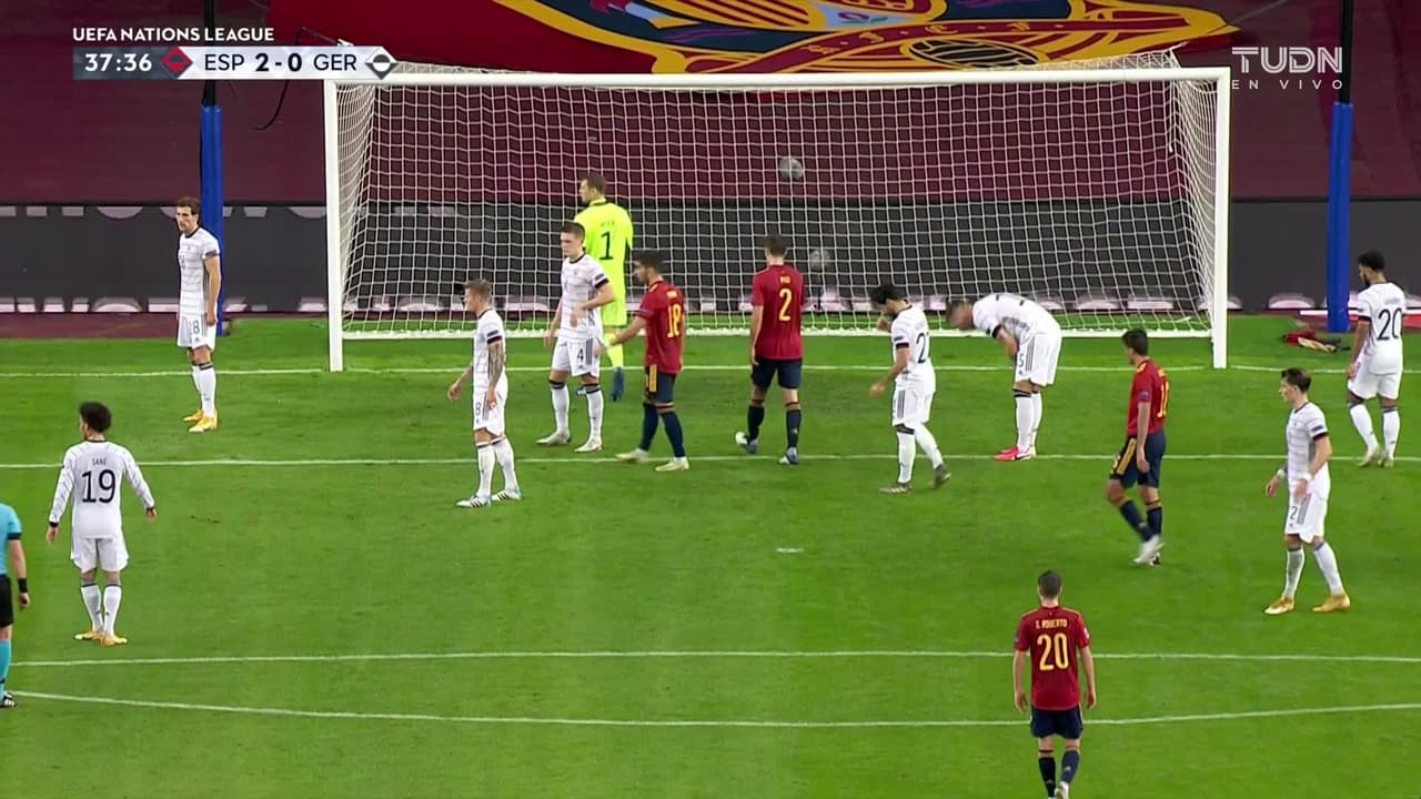 ¡Gol! España 3| Alemania 0. Rodrigo (España) disparo de cabeza desde el centro del área tras un saque de esquina.