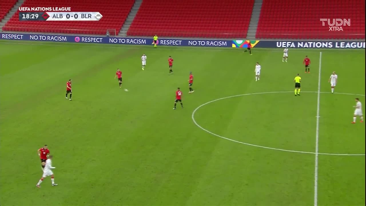 ¡Gol! Albania 1| Bielorrusia 0. Sokol Cikalleshi (Albania) disparo de cabeza desde el centro del área.