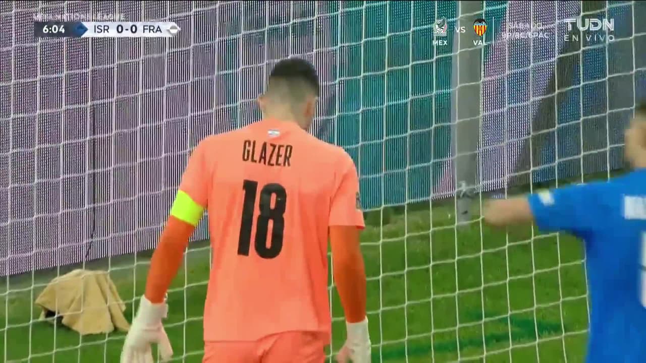 El guardameta de Israel calcula mal rebote del esférico y disparo del futbolista de Francia, que no llevaba mucho, se convierte en el primero para los galos.