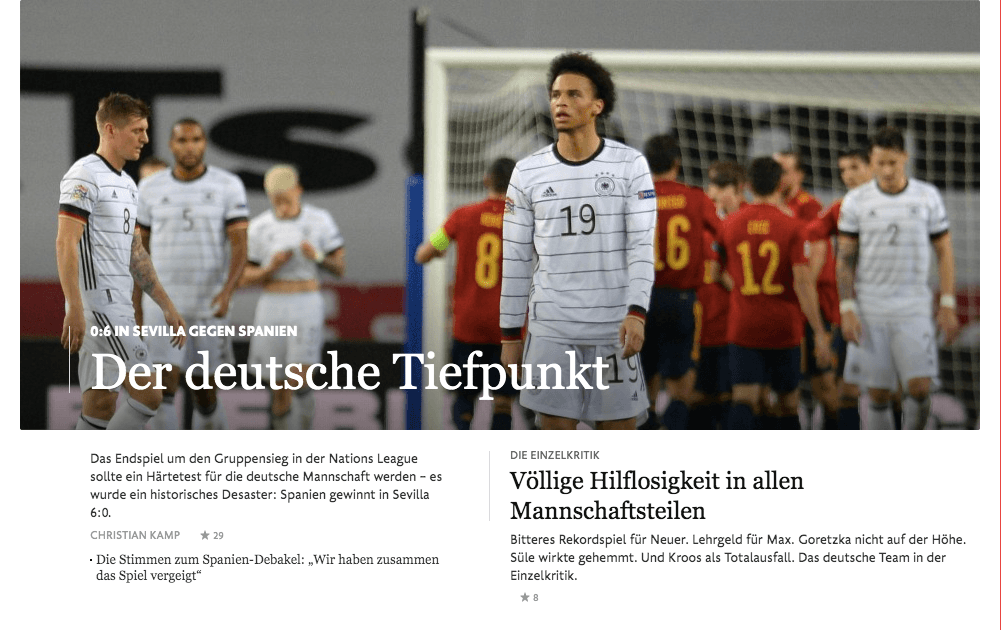 El Frankfurter Allgemeine, referencia nacional de noticias, abri´o su portal con la consigna "El bache alemán", además de cuestionar si este equipo tocó fondo ya tras el partido de la UEFA Nations League.