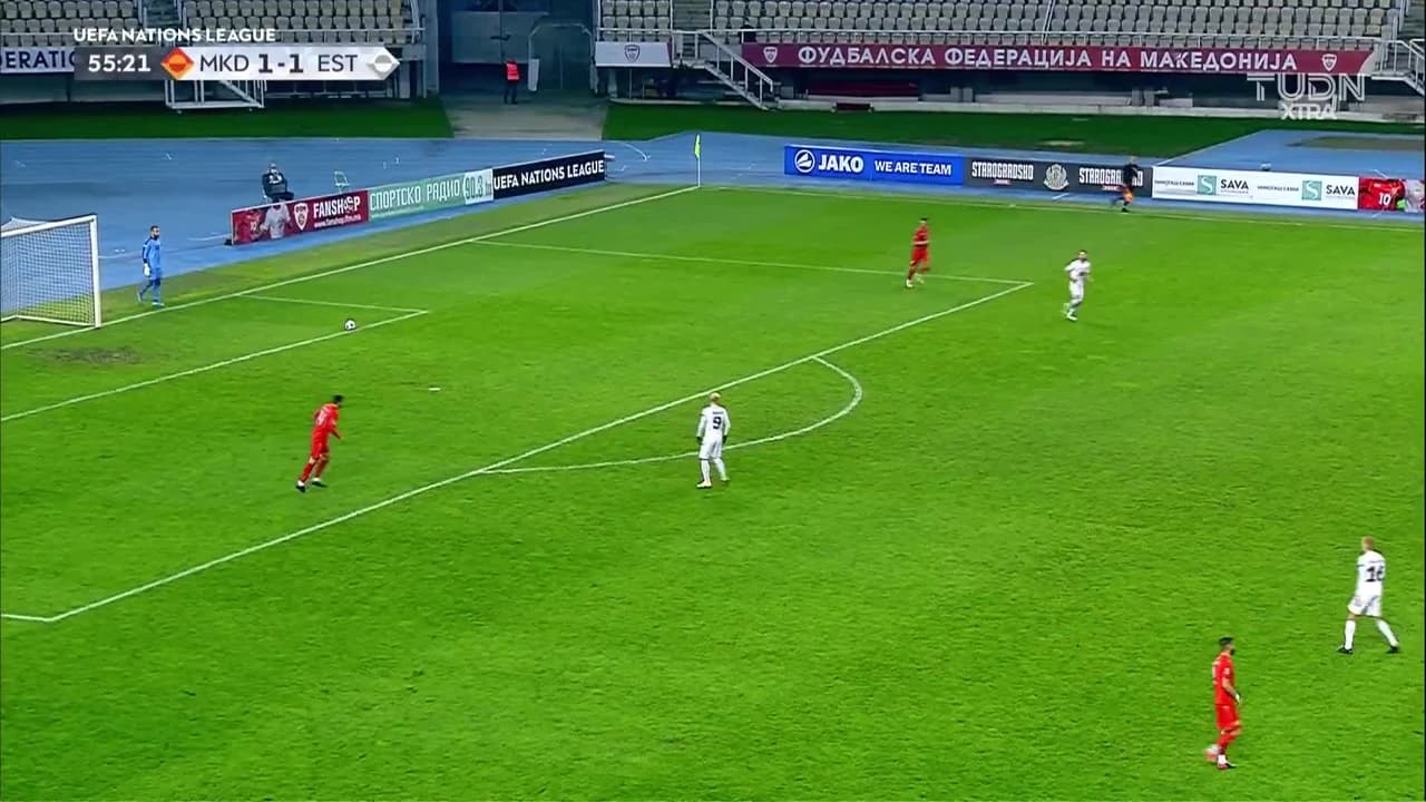 Tiro atajado por abajo a la izquierda. Aleksandar Trajkovski (Macedonia) Disparo con la derecha desde fuera del área. Asistencia de Ivan Trickovski.
