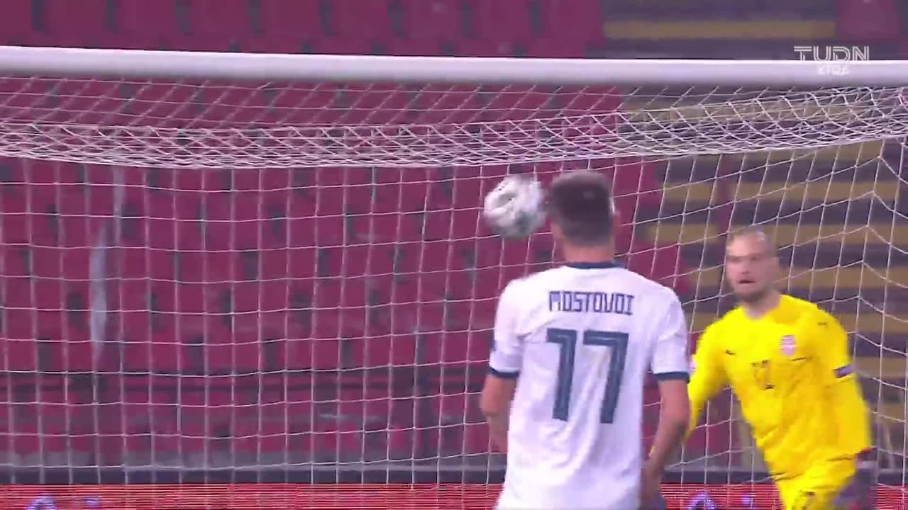 Tiro atajado al ángulo superior derecho. Aleksandr Erokhin (Rusia) disparo de cabeza desde el centro del área. Asistencia de Andrey Mostovoy con un centro al área.