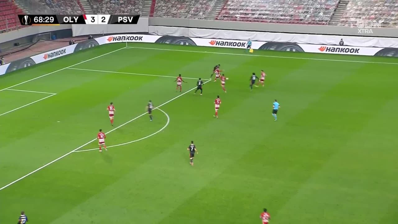 Tiro atajado raso al centro del arco. Eran Zahavi (PSV Eindhoven) Disparo con la derecha desde fuera del área.