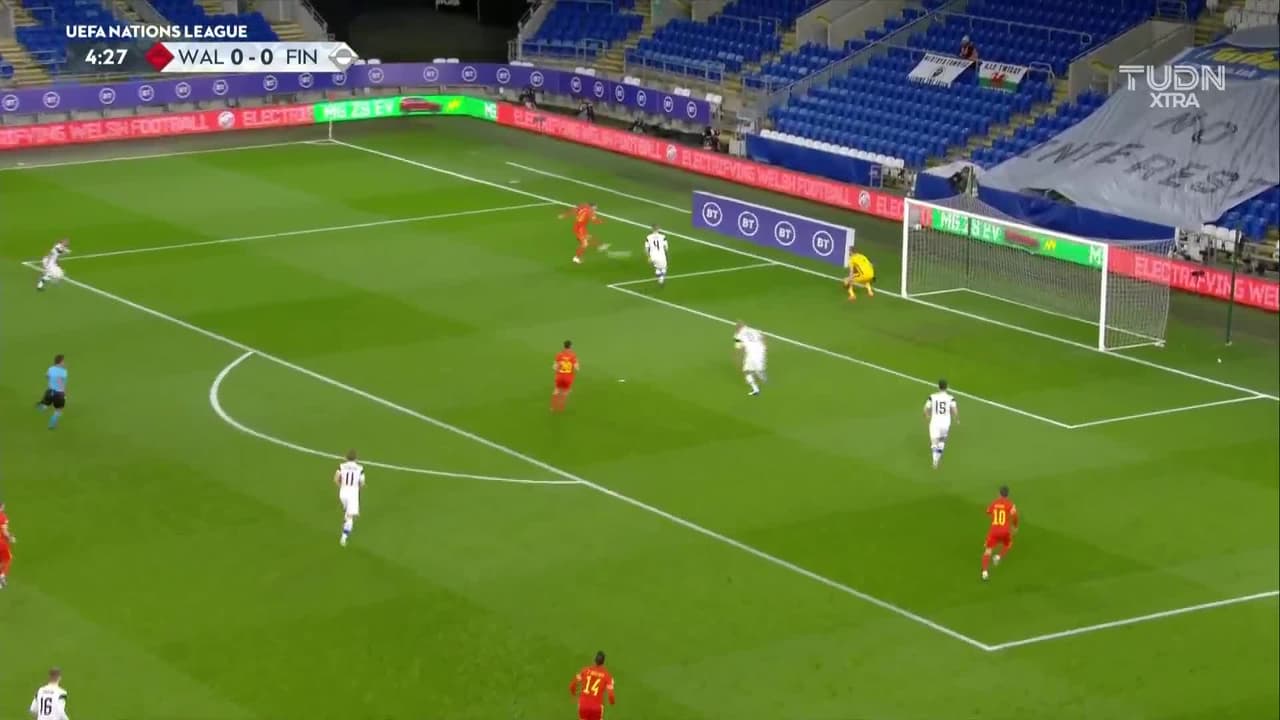 Tiro atajado raso al centro del arco. Gareth Bale (Gales) zurdazo sin ángulo desde la izquierda.
