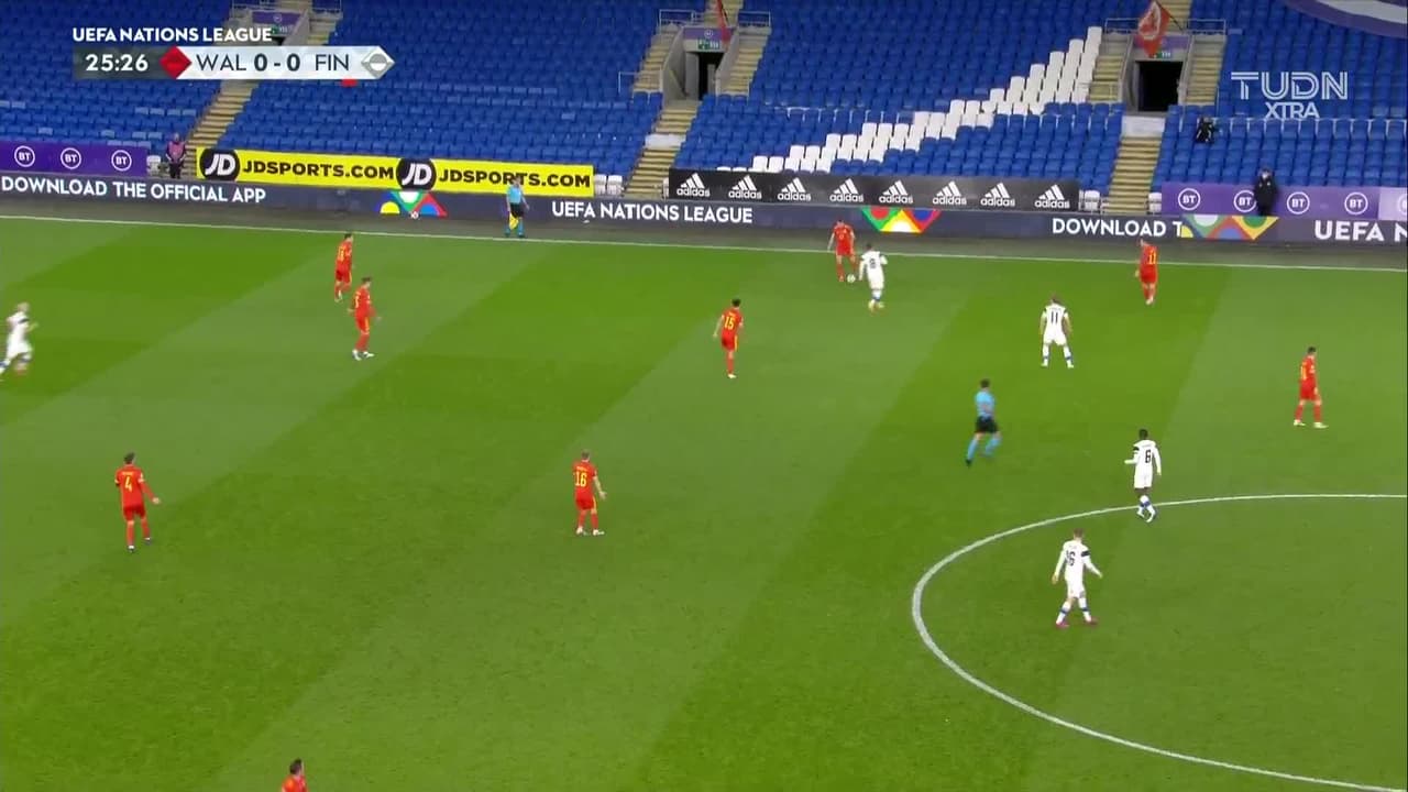 Tiro atajado por abajo a la izquierda. Gareth Bale (Gales) zurdazo desde muy cerca. Asistencia de Daniel James con un centro al área.
