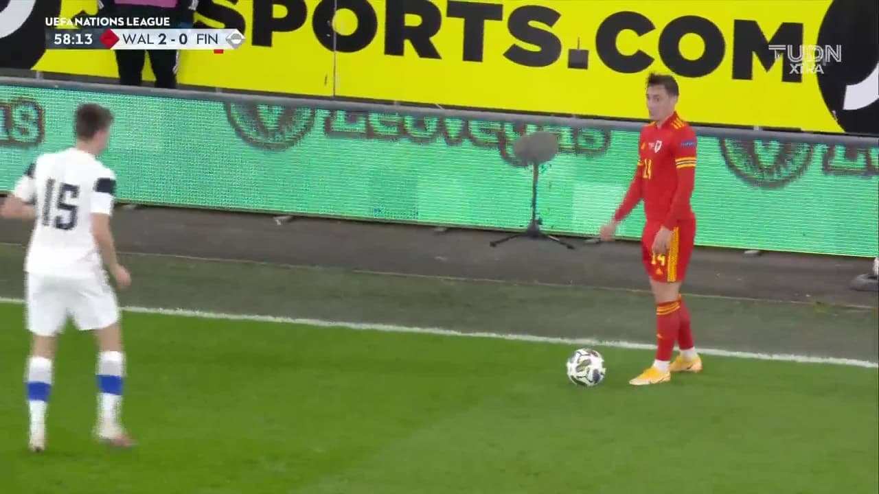 Tiro atajado junto al lado derecho de la portería. Gareth Bale (Gales) zurdazo desde fuera del área. Asistencia de Joe Morrell.